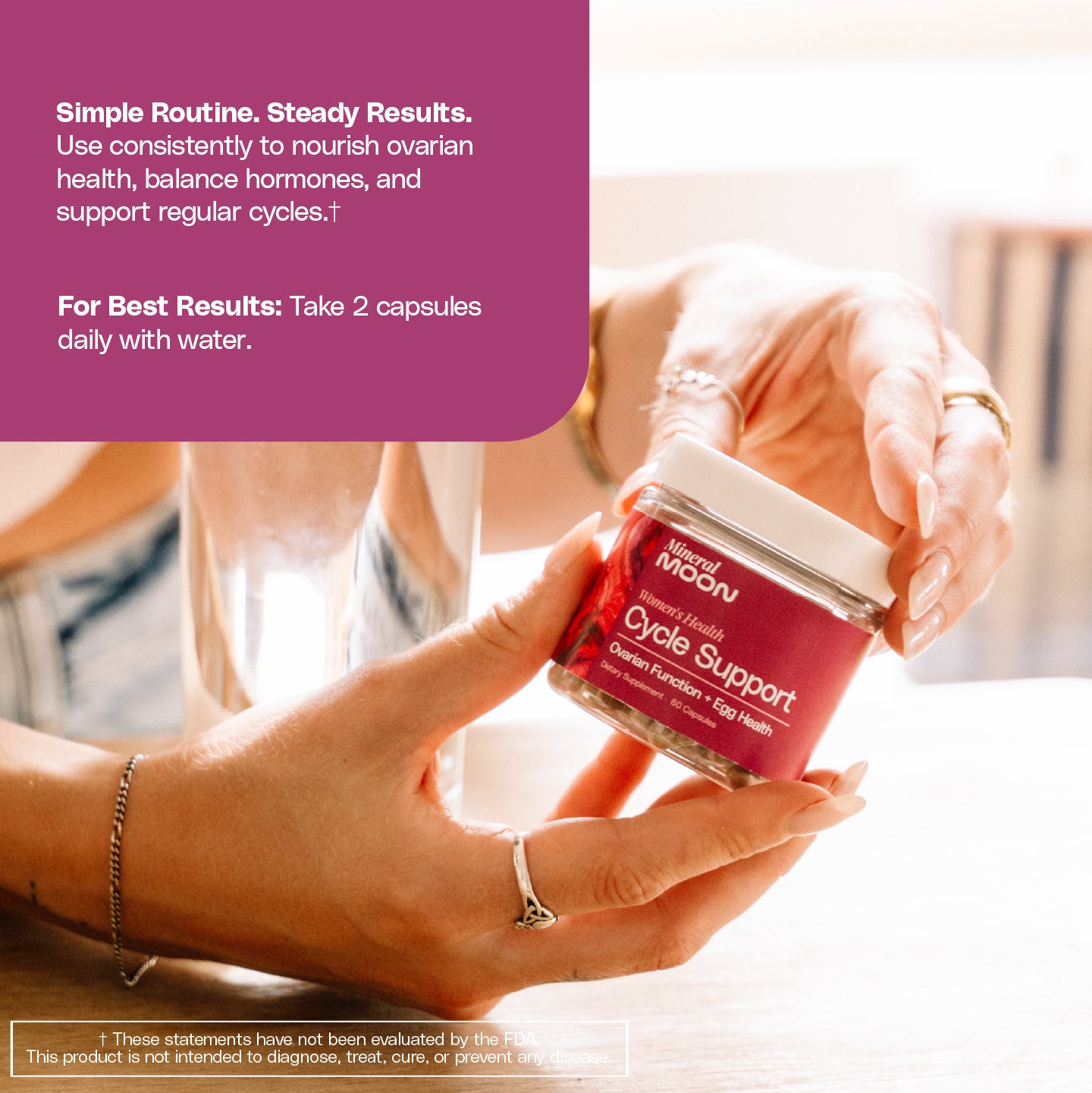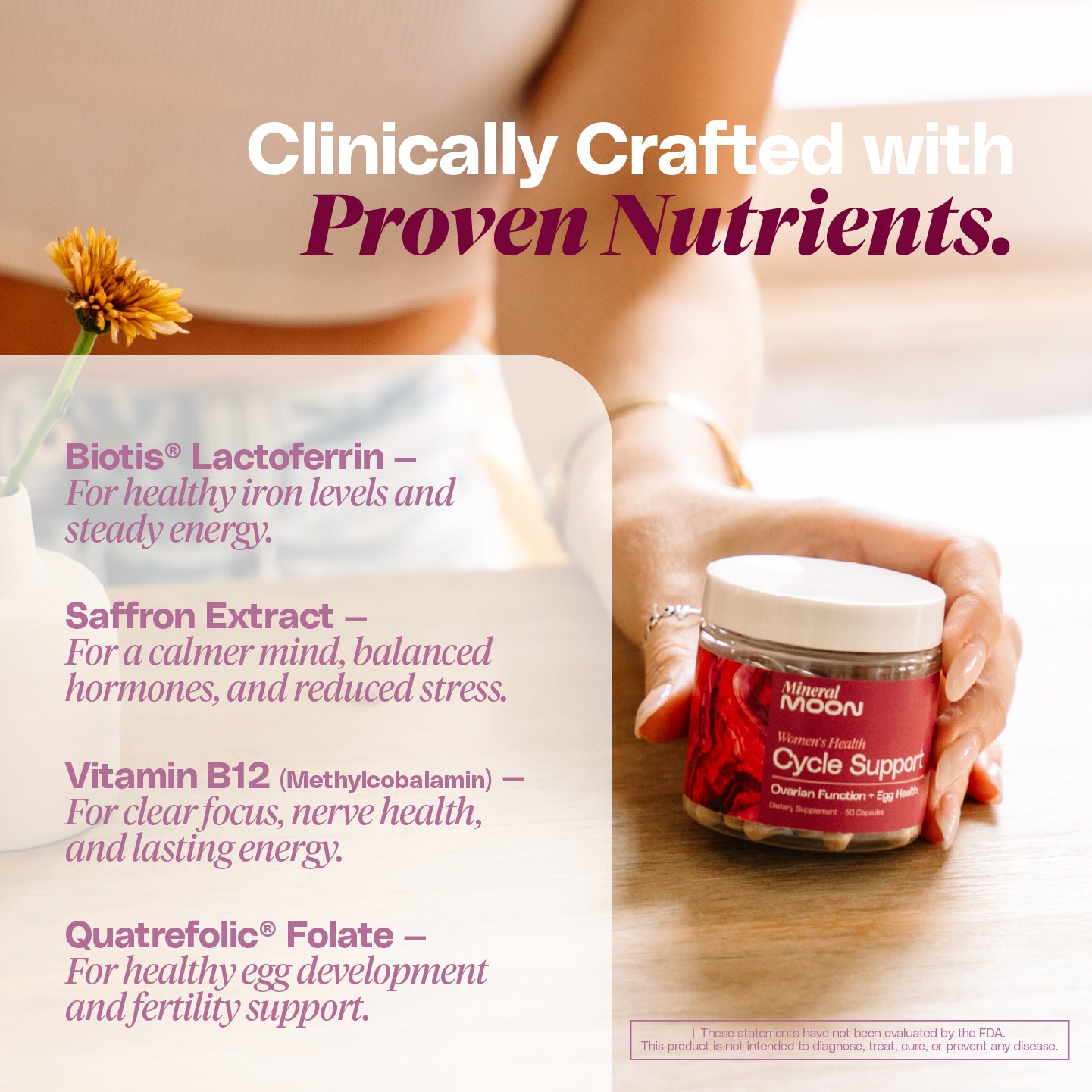 Formulated with clinically studied nutrients like Quatrefolic® folate, Cycle Support nourishes ovarian function at the source, helping your reproductive system perform at its best.