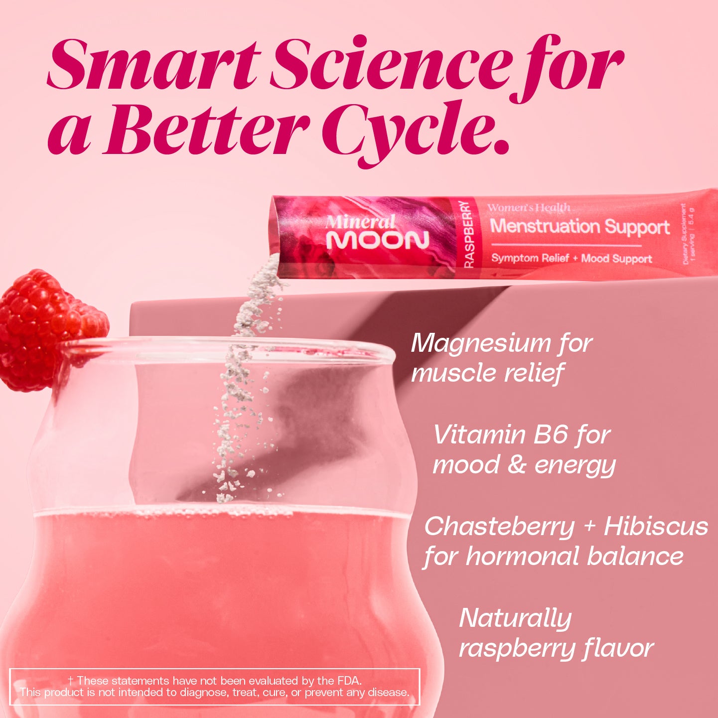 Say goodbye to tough periods and hello to a little more ease. Menstruation Support is a refreshing, science-backed raspberry drink that helps you move through your cycle with comfort and confidence. Formulated to target common PMS symptoms like cramps, bloating, irritability, fatigue, and nausea, it’s designed to make your time of the month feel a whole lot better. Sip as needed for relief and get back to being you.